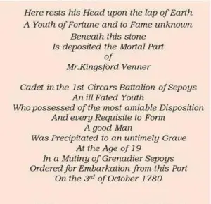 All the three British officers might have been buried at the Old European cemetery in Visakhapatnam but today, only the grave of a young officer by the name Kingsford Venner is left intact. The inscription on this grave, mentioning the mutiny, stands testimony to this historic event. An image of this is shared below: