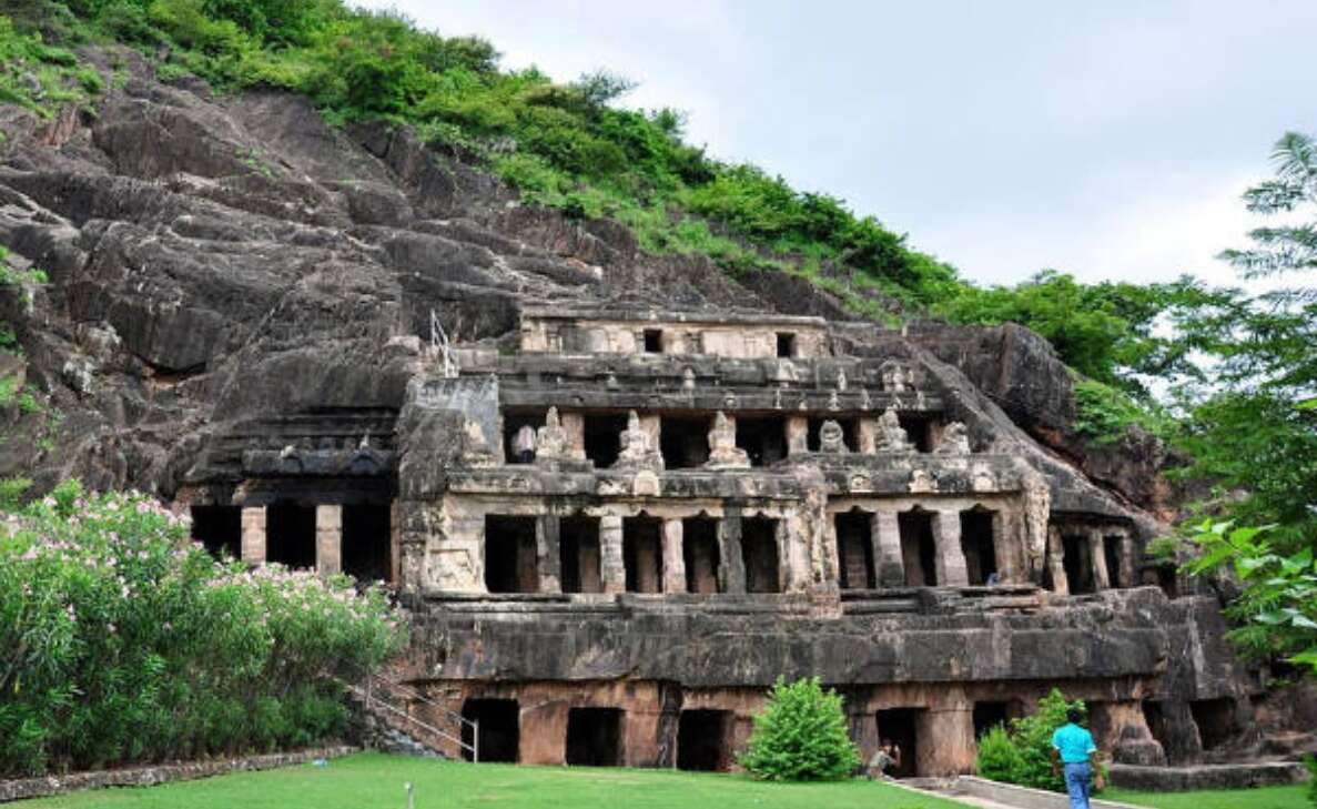 Undavalli Caves are a monolithic example of Gupta-style rock-cut architecture. Cut from the Northern slopes of a hill, these caves date back to the 5th Century. Endowed with several caves, the largest and main attraction is the four-storied caves with the Anantasayana Vishnu (Vishnu in a reclining position) sculpted from a single block of granite. The caves are surrounded by green hills overlooking the Krishna River.