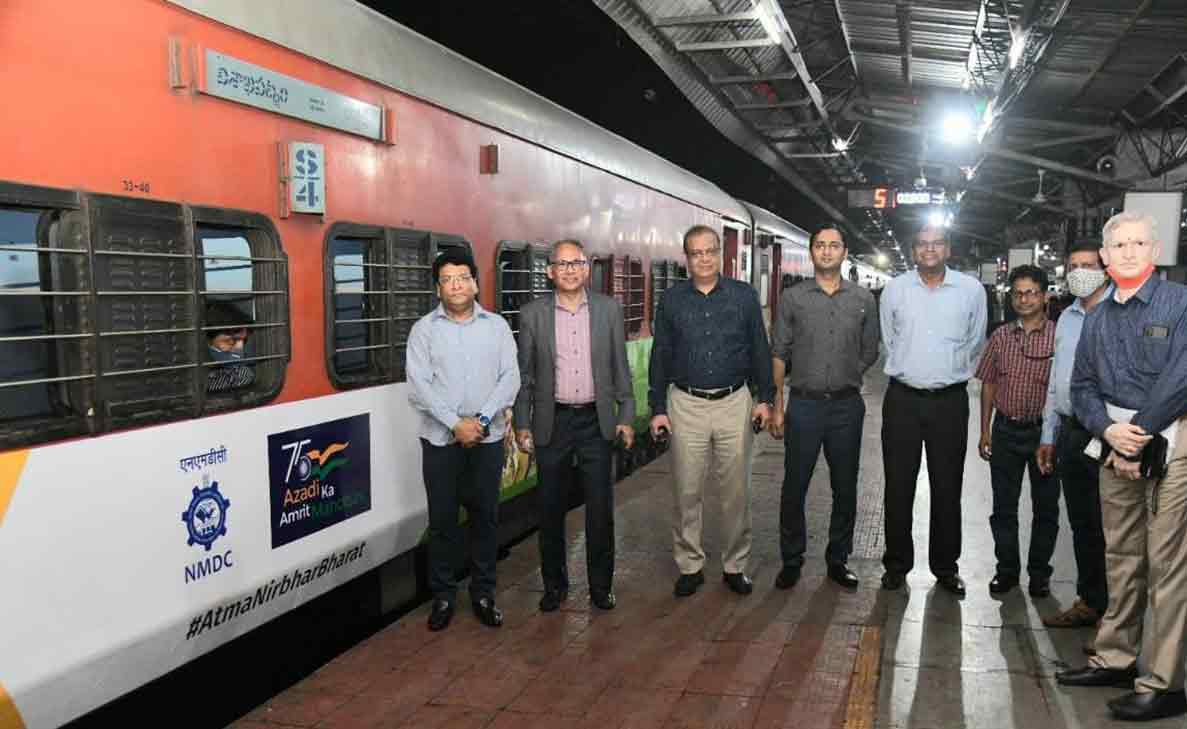 Branding has been done on two rakes of the AP Express train. One of these rakes was flagged off on Monday by NMDC Chairman-cum-Managing Director, Sumit Deb. Divisional Railway Manager Anup Kumar Satpathy, Additional Divisional Railway Manager Sudhir Kumar Gupta and other representatives of the Waltair Railway Division and NMDC were also present at the flagging off ceremony.