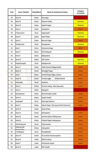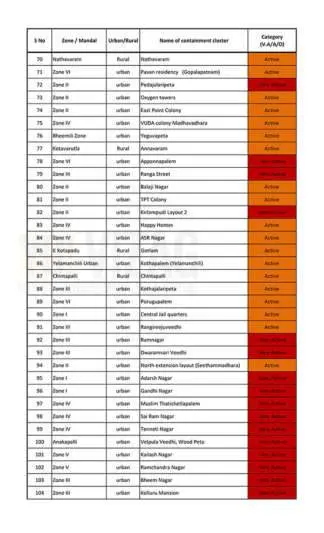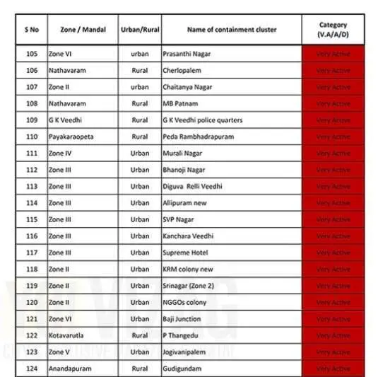 The aforementioned categories indicate the status of the demarcated areas. If a case has been reported in an area in the past six days, then the cluster will be categorised under very active. If a COVID-19 case hasn’t been reported in a containment zone/cluster in the past 6-14 days, it comes under the active category. Likewise, if a containment cluster doesn’t register a coronavirus case in the past 14 days, the zone will be placed under the dormant category. Further, the authorities have also denotified 26 clusters so far. The list of containment zones in Vizag is as follows: