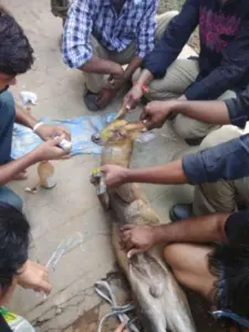 A local beat officer, who arrived at the spot, instructed his fellow mates to get a vehicle and all the necessary gear to safely shift the animal to the zoo. Zoologist Chetan, who along with other forest staff led the rescue operation, safely took the deer to the zoo and got it medically treated. The doctor, who gave the animal some first aid treatment, informed that the injuries it sustained were minor ones and there was nothing serious. Subsequently, the deer was transported back to Kambalakonda.