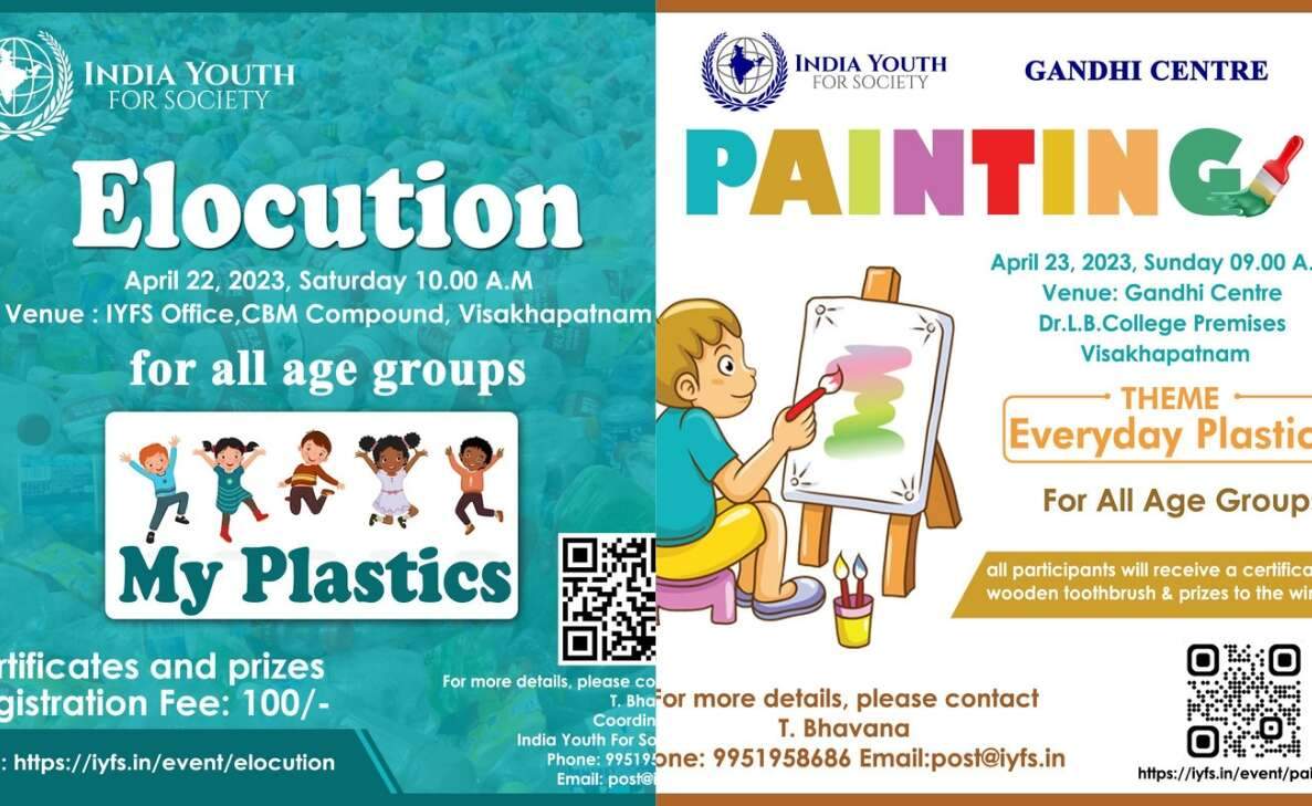Indian Youth for Society, on the occasion of its 12th foundation day, is conducting elocution and painting competitions for different age groups, with the theme ‘Everyday Plastics.’ Elocution will be held at the IYFS office in CBM Compound on Saturday, 22 April, from 10 am and painting at Gandhi Centre, Bullayya College, on Sunday, 23 April, from 9 am onwards. For registrations, contact +91 9951958686. Participants will be divided into 8-11 years, 12-15 years, 16-20 years, and 21-25 years age groups.
