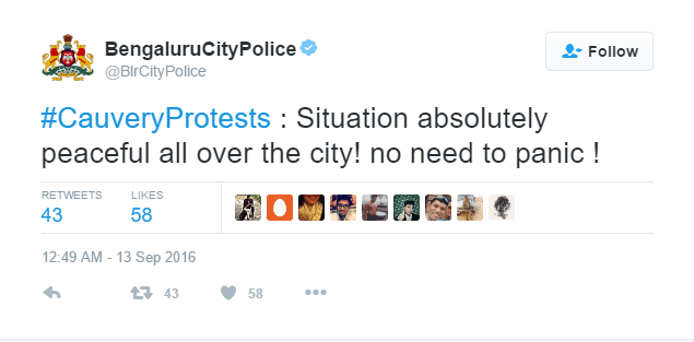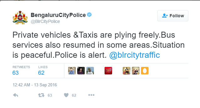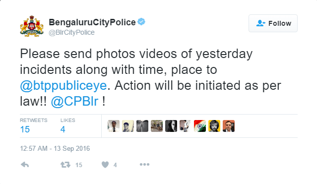 On 13th of September, the Bengaluru City police tweeted that private vehicles and taxis are plying freely, and the situation is peaceful and police is alert. They also requested people to send the pictures and videos of all the violent incidents that took place yesterday along with the place and time. Public was also advised to use the police helpline to report any other violent incidents.