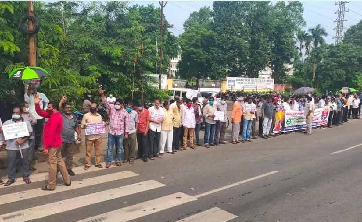 A 10 km long ‘Maha Manava Haram’ (mega human chain) from Aganampudi to Akkireddypalem in Visakhapatnam was held on Sunday. This agitation was organised by Visakha Ukku Parirakshana Porata Committee (VUPPC) to mark 200 days into the protest against the Central Government’s privatisation of Visakhapatnam Steel Plant (VSP).