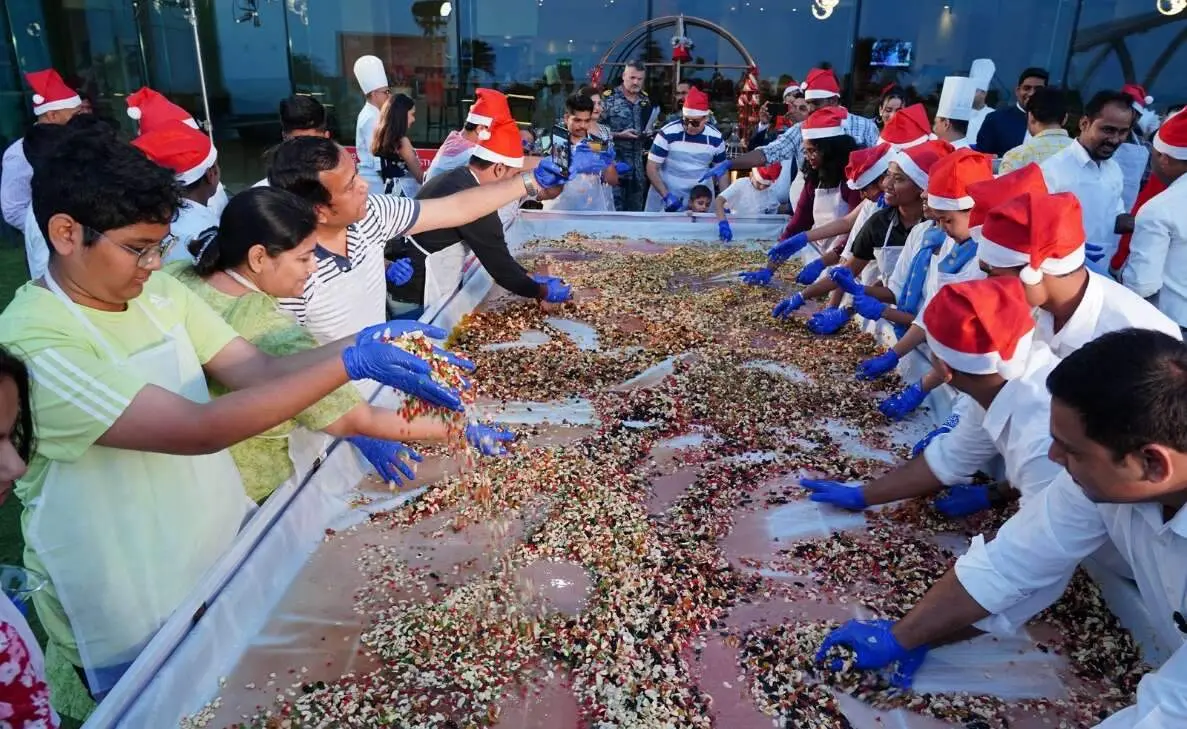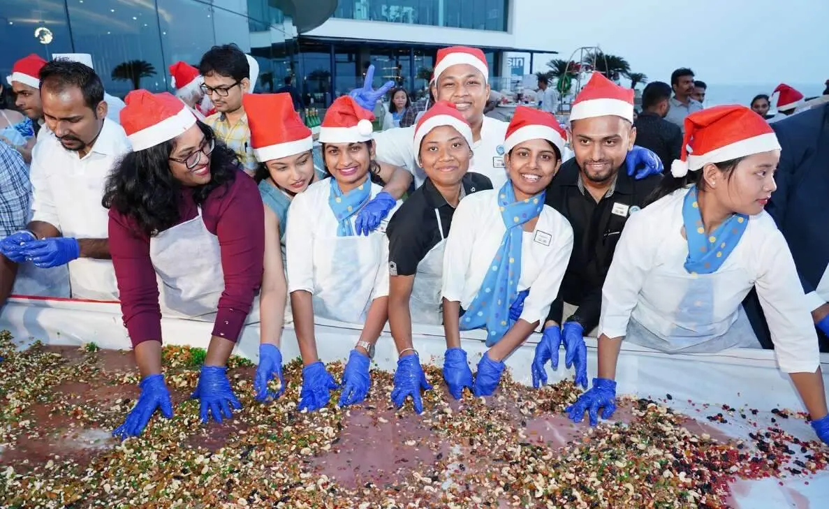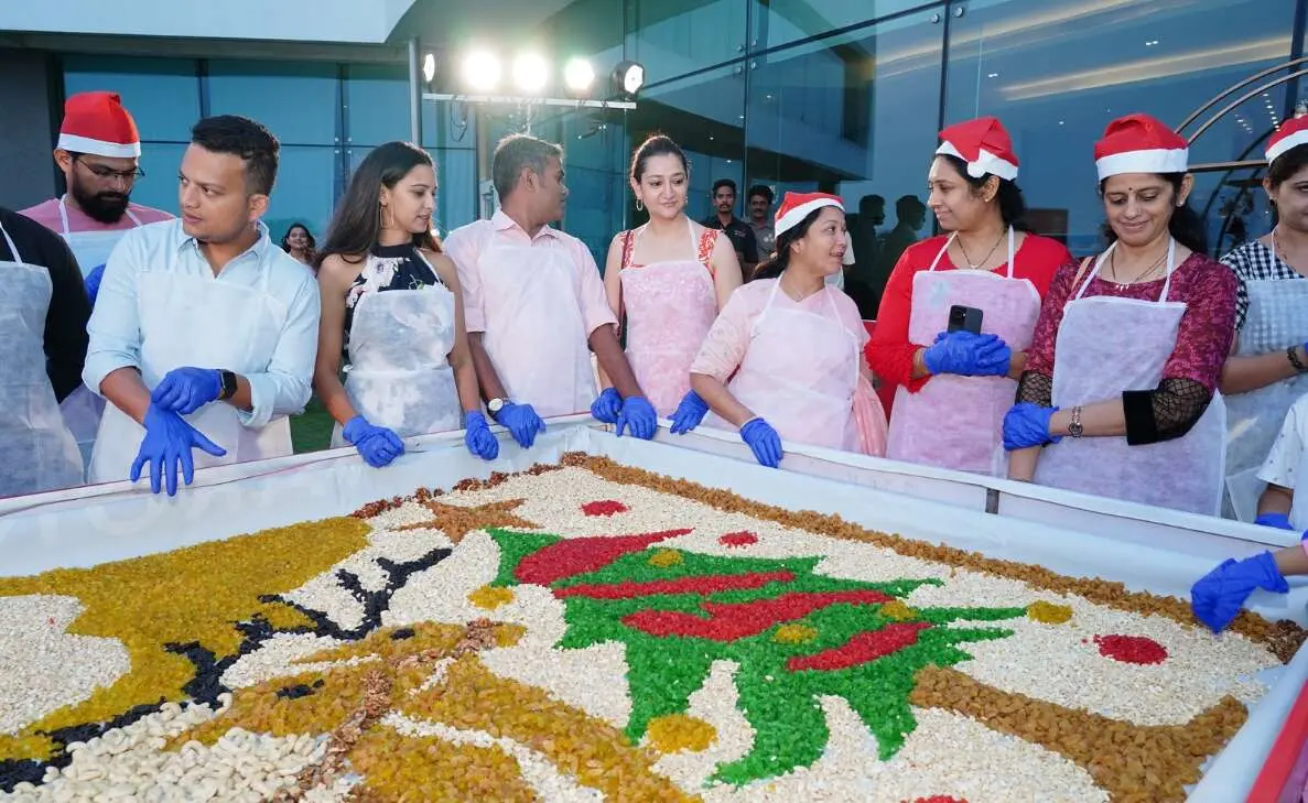 A huge tray, loaded with a wide variety of dry fruits, was set for the participants to put their hands into action. The scores of enthusiasts then excitedly soaked the dry fruits in premium wine and rum, kicking off the event. The organisers artistically arranged the dry fruits to look like Santa Claus riding his reindeer sleigh. Tiny toddlers, the young, and the old from across Vizag partook in the fun cake mixing event with equal enthusiasm at the Novotel Varun Beach.