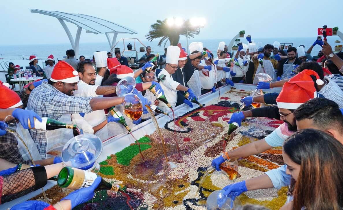 A huge tray, loaded with a wide variety of dry fruits, was set for the participants to put their hands into action. The scores of enthusiasts then excitedly soaked the dry fruits in premium wine and rum, kicking off the event. The organisers artistically arranged the dry fruits to look like Santa Claus riding his reindeer sleigh. Tiny toddlers, the young, and the old from across Vizag partook in the fun cake mixing event with equal enthusiasm at the Novotel Varun Beach.