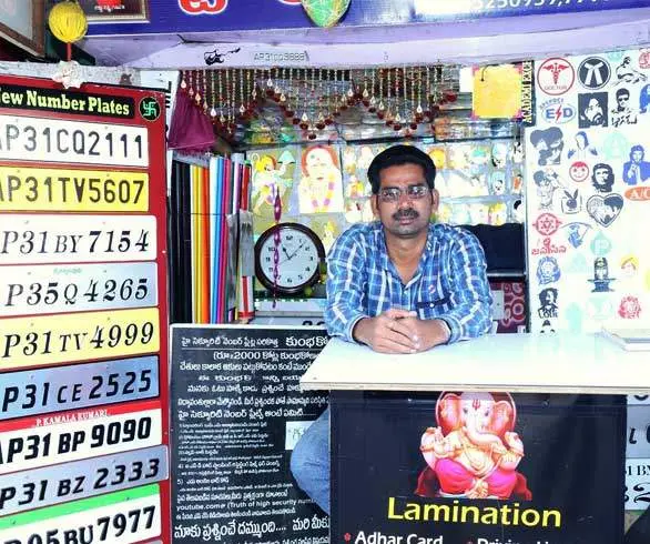 ‘I graduated in Fine Arts from Andhra University, but the market outside is very different. Customers today prefer to get their photographs enhanced with photoshop rather than go for a hand-drawn portrait. So, while I still dabble with art now and then, customers usually buy a ready-made sticker rather than get a customized piece of art made. They want things quicker and at a lesser price. And so, instead of pursuing a career in art, I opened this little shop and have been working in this line since the past ten years. My shop sells stickers for cars and bikes. I also print photocopies, but the main income is through the number plates we make for four wheelers and two-wheelers. However, given today’s market condition where the government is insisting on high security smart registration plates, we may soon lose that market.