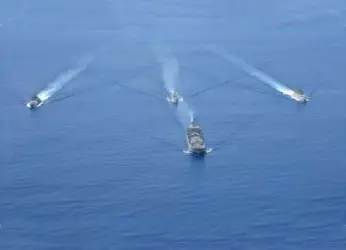 Indian Naval Ships Shivalik, Sahyadri, Jyoti and Kamorta of the Eastern Fleet manoeuvring in the Andaman Sea. The task force is on a routine deployment to Malacca Strait, the Java
