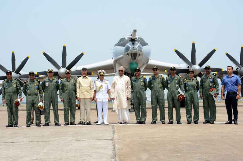 Hon’ble Chief of Andhra Pradesh Shri Nara Chandrababu Naidu welcomed the TU-142M Long Range Maritime Patrol aircraft of the Indian Navy which landed at INS Dega for the last time this morning. A special ceremony organised at INS Dega to formally welcome the aircraft at Visakhapatnam was attended by Shri P Ashok Gajapathi Raju, Hon’ble Union Civil Aviation Minister, Govt. of India, Vice Admiral HCS Bisht, PVSM, AVSM, ADC, Flag Officer Commanding-in-Chief, Eastern Naval Command, MPs, MLAs and host of other Civil Dignitaries. On arrival of the TU, the Hon’ble CM interacted with the crew members and exchanged mementos.