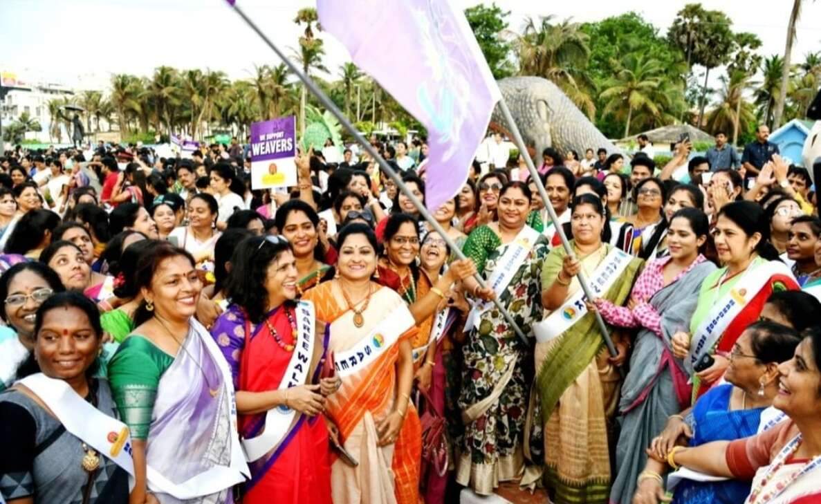 On Sunday morning, 6 August 2023, the RK Beach Road came alive with an event that radiated energy, culture, and a sense of unity. The Handloom Saree Walk, organised by The Spirit of Vizag society, was a remarkable spectacle that witnessed the participation of 10,000 women draped in handloom sarees. This event not only celebrated the spirit of womanhood but also carried a dual agenda of promoting a healthy lifestyle and showcasing the rich tradition of handlooms in the country.