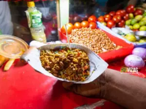 A small pani puri stall outside Fresh Choice in vizag mixes all the dry ingredients of its pani puri dish into a chaat. Known as ‘churmur’, it is popular with students and other locals.
