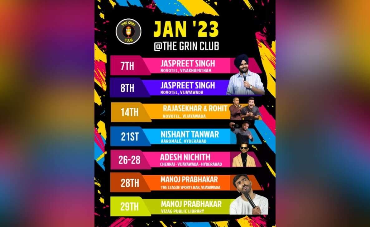 Originally based out of Vijayawada, The Grin Club has been a prominent figure in the growth of comedy shows in the Telugu-speaking state, conducting frequent shows in Vizag. With over 4+ years of experience and 25+ comedians, this energetic group organised more than 40 shows in 2022. Open mics are regularly organised to support local talent and promote regional comedy. Rajasekhar Mamidana, Nishant Tanwar, Harsha Gujral, Inder Sahani, and Shreya Priyam were among the prominent names The Grin Club presented the last year in Vizag and Vijayawada.