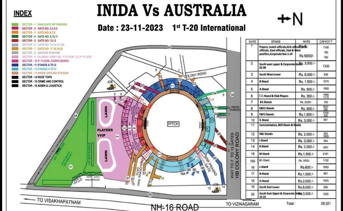 - Ticket holders from Visakhapatnam towards the stadium can travel on NH 16, reach the stadium, and park at their respective junctions. Those with general tickets can turn left from Oldage Junction, reach Sanketika Engineering College Ground, and park their vehicles.